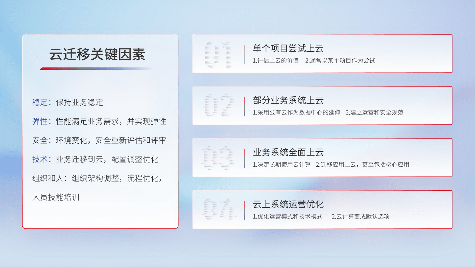 结合实际业务,,,从规划设计、、云平台选型、、、云原生改造、、、、数据迁移、、集成交付,,,,迁移全过程为客户识别最佳上云路径,,,,做好风险识别管理,,设计网络架构、、、、身份权限、、、、安全审计合规、、、、操作审计、、、日志审计、、、监控告警策略、、多站点容灾设计等,,,,对云上基础设施进行整体规划,,,提升IT治理水平,,,以满足弹性、、、高可用、、高性能的需求。。